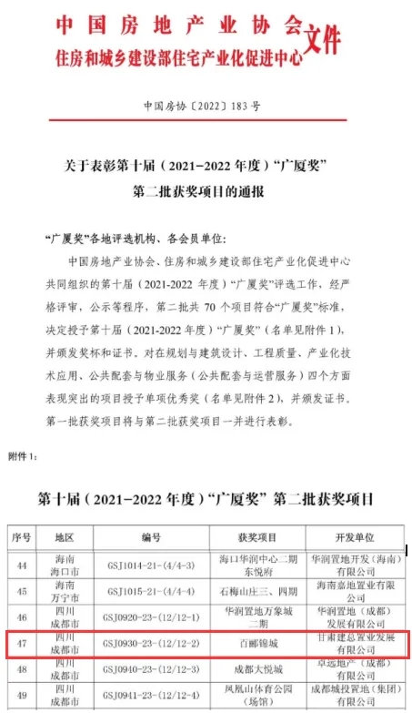 近日,由甘肅建總置業(yè)發(fā)展有限公司成都公司開發(fā)建設的百酈錦城項目榮獲中國房地產(chǎn)業(yè)最高榮譽“廣廈獎”。