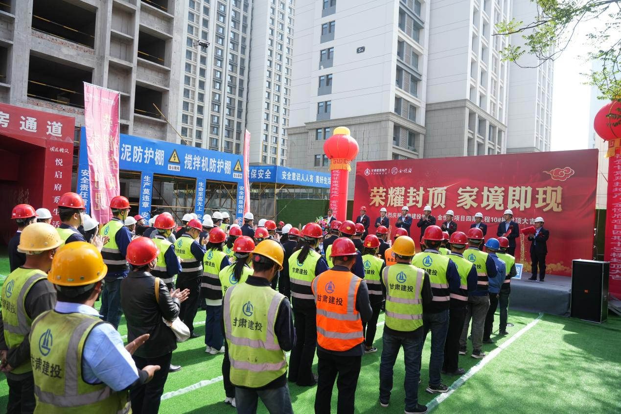 4月30日,甘肅建投地產(chǎn)·金悅府項目四期舉行10#樓封頂儀式。蘭州市城關(guān)區(qū)嘉峪關(guān)路街道黨工委副書記、主任王志剛,置業(yè)公司副總經(jīng)理寇建國,建科院總會計師李逢孝,建設(shè)公司副總經(jīng)理韓鈁及相關(guān)合作單位負責(zé)人到場參加儀式,整個儀式現(xiàn)場裝飾一新,呈現(xiàn)出一派喜慶祥和的氣氛。