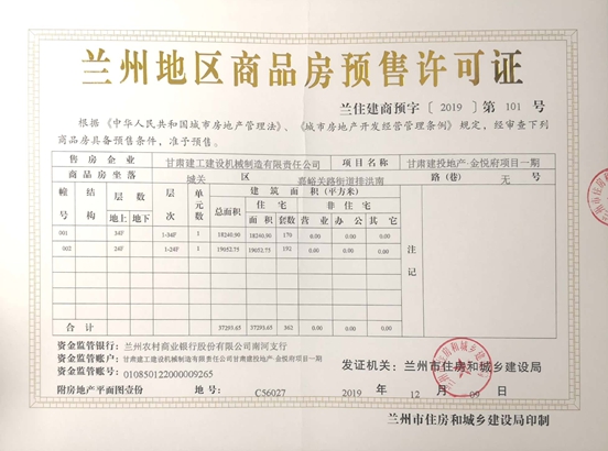 近日,甘肅建投地產(chǎn)·金悅府項(xiàng)目一期成功取得《商品房預(yù)售許可證》,為項(xiàng)目后續(xù)工作的開展奠定了堅(jiān)實(shí)基礎(chǔ),標(biāo)志著甘肅建投地產(chǎn)·金悅府項(xiàng)目一期五證齊全,完成年底目標(biāo)任務(wù)。