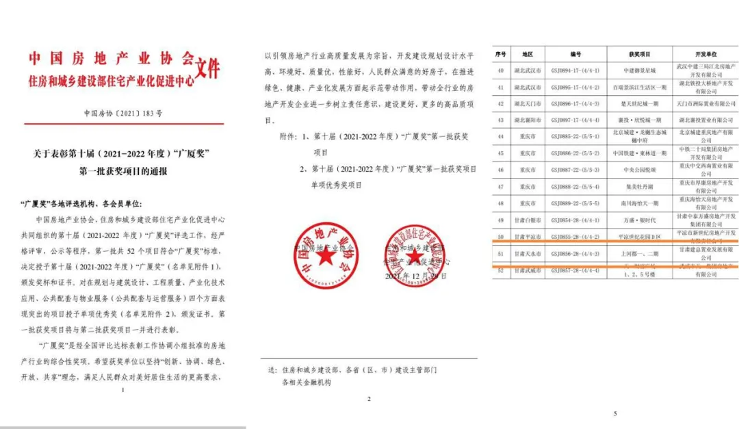 近日,由甘肅建投置業(yè)公司開發(fā)建設(shè)的天水上河郡一、二期住宅項(xiàng)目,榮獲第十屆(2021-2022年度)第一批中國房地產(chǎn)“廣廈獎”。該項(xiàng)目成為置業(yè)公司在天水開發(fā)建設(shè)的項(xiàng)目中第二個(gè)獲得該殊榮的項(xiàng)目。也是2022最驚喜的新年禮物。